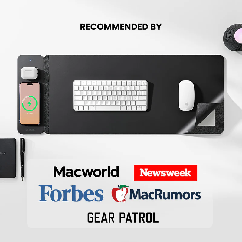 Reversible Desk Mat with a detachable wireless charging panel that fast charges your smartphone and earbuds simultaneously. Features water-resistant vegan leather on one side and plush felt on the other side.
